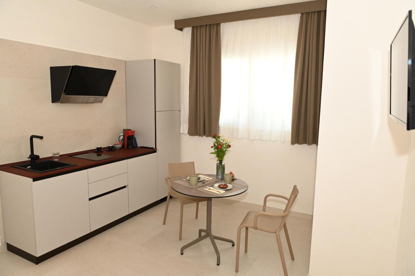Standard Apartment. Boasting a private entrance, this air-conditioned apartment comes with 1 living room, 1 separate bedroom and 1 bathroom with a shower and a bidet. Guests can make meals in the fully equipped kitchen that has a stovetop, a refrigerator and kitchenware. Featuring a balcony with ancourtyard view, this apartment also features soundproof walls and a flat-screen TV. The unit has 2 beds. ;